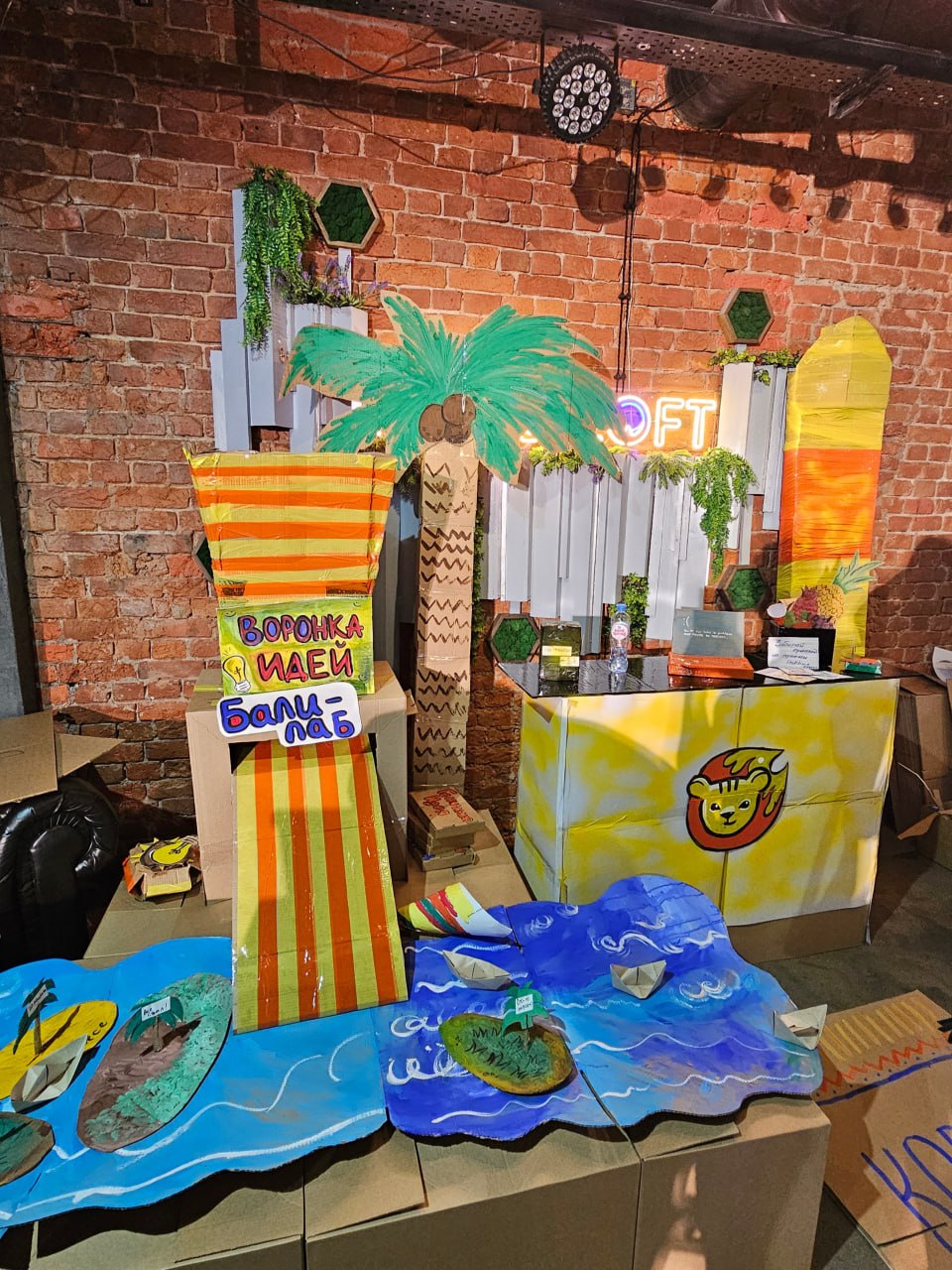 После продумывания концепции мы принялись строить зоны из картона, добавляя в них детали. Например, в зону отдыха добавили “ёу-йогу” и “гравимаг” — гамак с эффектом невесомости. Сделали робота-корзину для мусора и назвали его “Авто-трешницей” — он сам едет, собирает мусор и перерабатывает его.